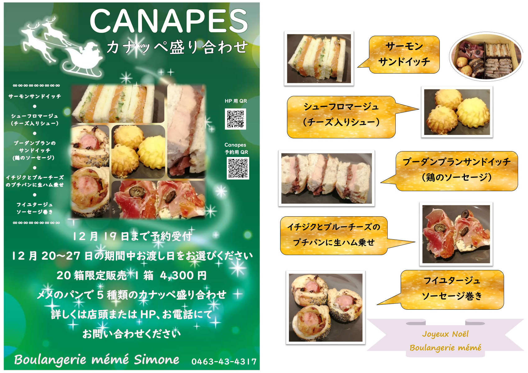 今年もメメシモーヌの5種類のパンで作るカナッペ盛り合わせを販売します。